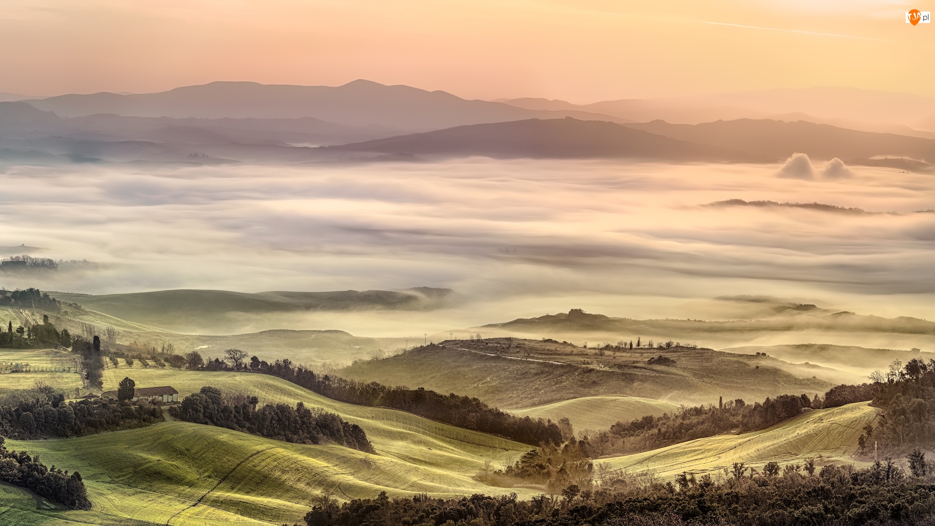 Wzgórza, Włochy, Val di Cecina, Poranek, Toskania, Pola, Mgła, Dolina