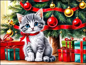 Prezenty pod choinką świąteczną z kolorowymi bombkami i