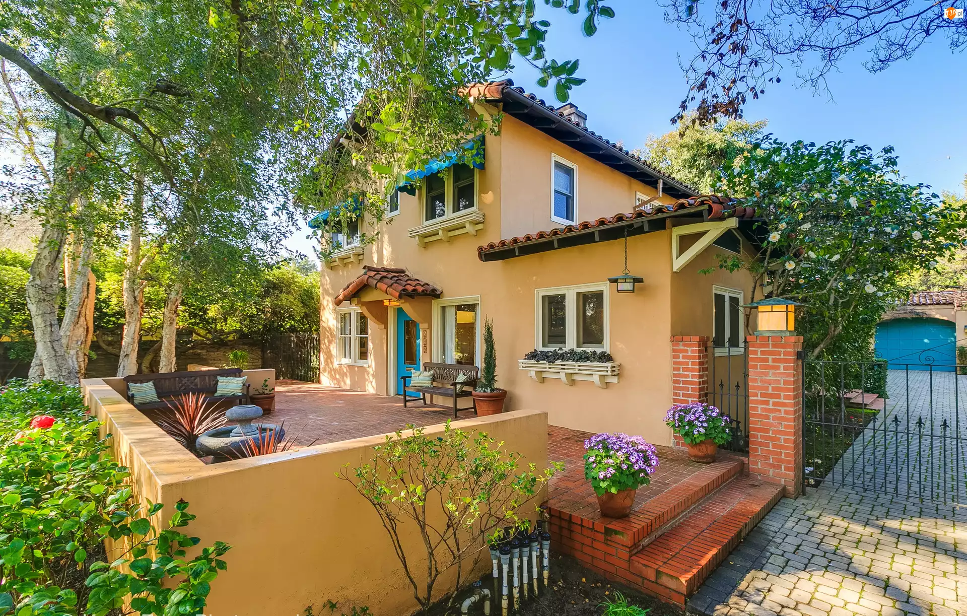 Dom, Kwiaty, Taras, Drzewa