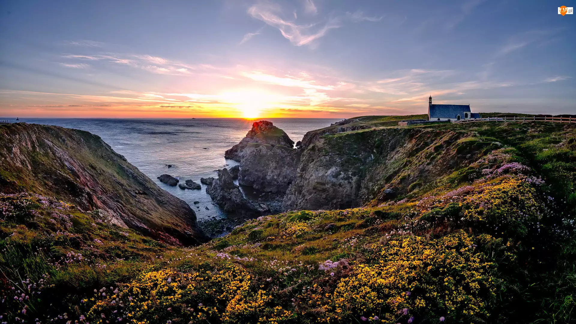 Skały, Kwiaty, Zachód Słońca, Morze, Niebo, Dom, Wybrzeże