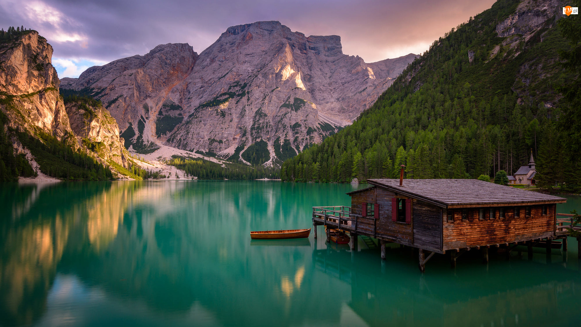 Łódki, Góry, Drzewa, Południowy Tyrol, Dolomity, Włochy, Dom, Jezioro Pragser Wildsee, Drewniany