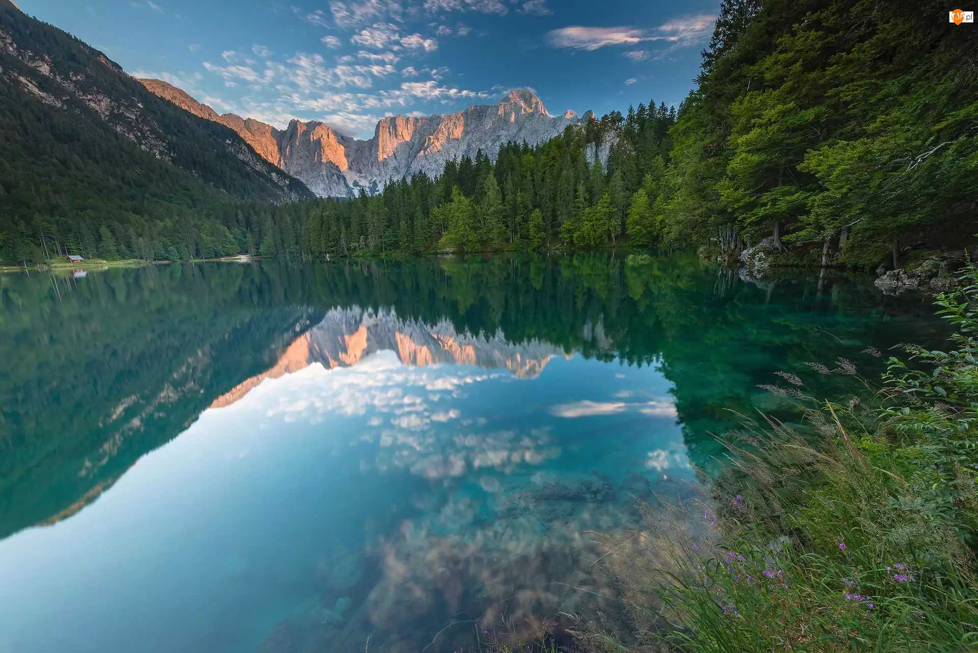 Las, Alpy Julijskie, Prowincja Udine, Chmury, Góry Mangart, Włochy, Odbicie, Jezioro Lacs de Fusine