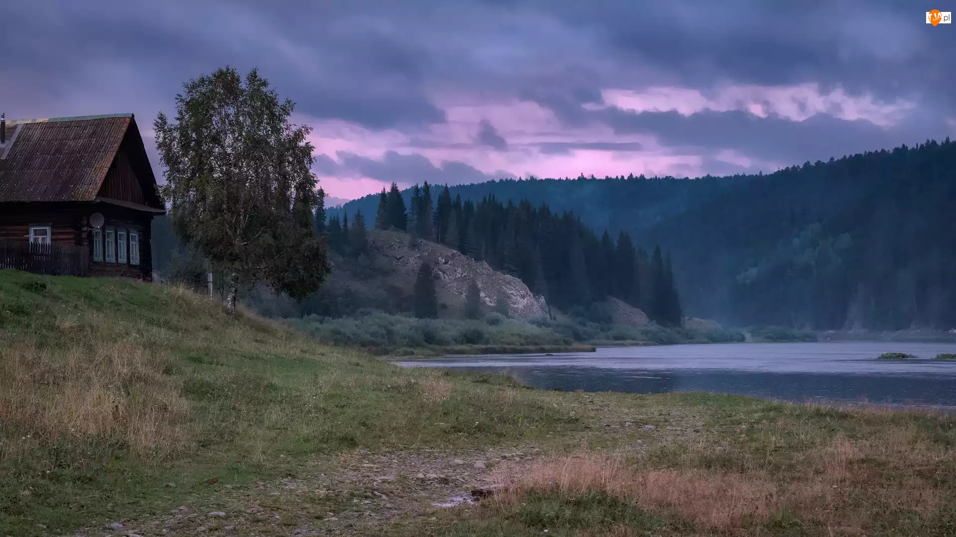 Skały, Wieś Kyn, Trawy, Rosja, Ural, Chmury, Dom, Wzgórza, Drewniany, Brzoza, Rzeka Czusowaja, Kraj Permski
