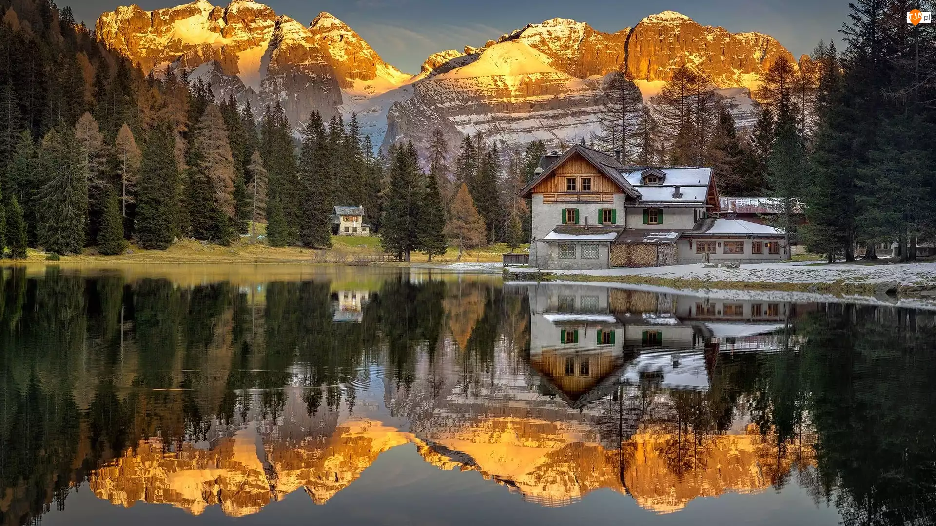 Dom, Odbicie, Jezioro, Góry, Drzewa