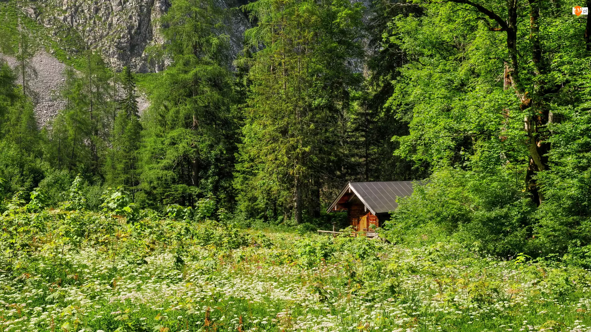 Góry, Las, Polana, Drzewa, Dom, Kwiaty