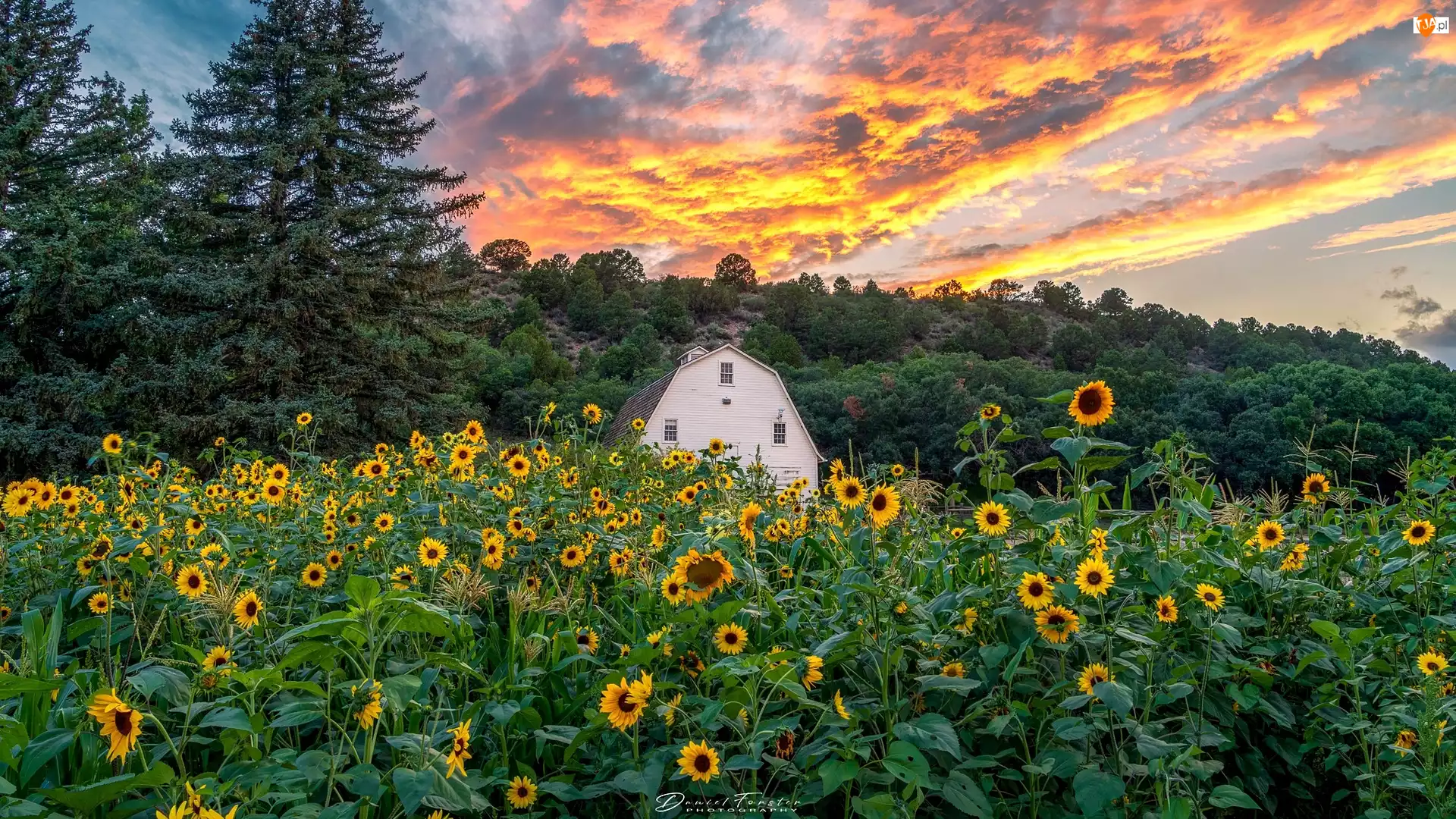 Las, Zachód słońca, Dom, Słoneczniki, Drzewa
