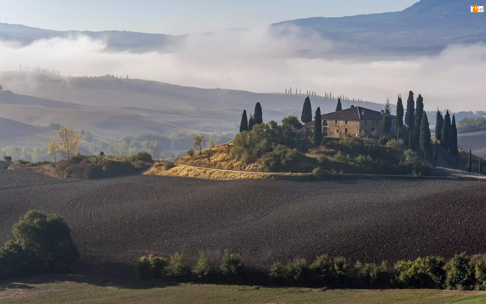 Dom wśród cyprysów na zamglonych wzgórzach Tos