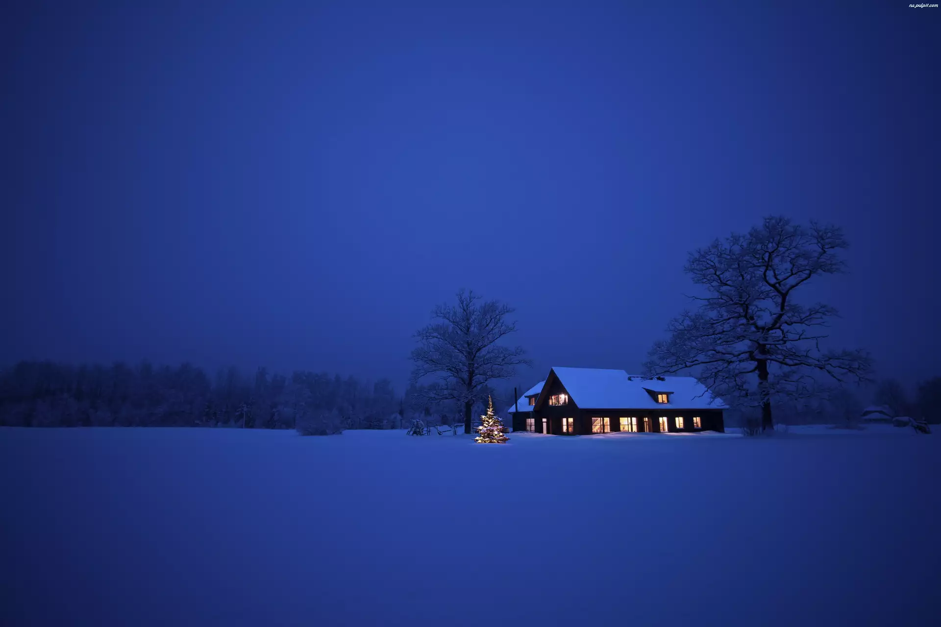 Dom, Zima, Drzewa, Choinka