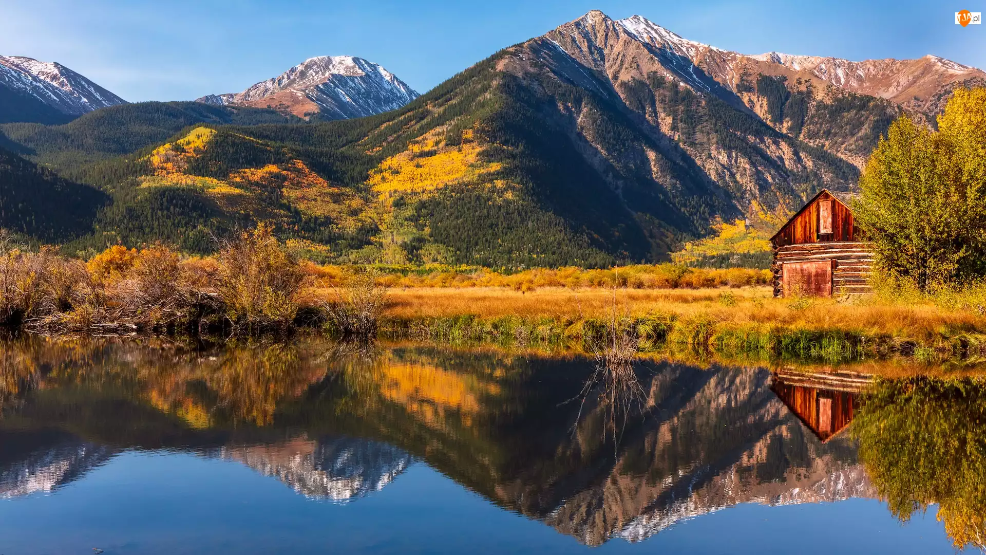 Odbicie, Dom, Drewniany, Jesień, Kolorado, Stany Zjednoczone, Jezioro, Góry, Twin Lakes, Drzewa
