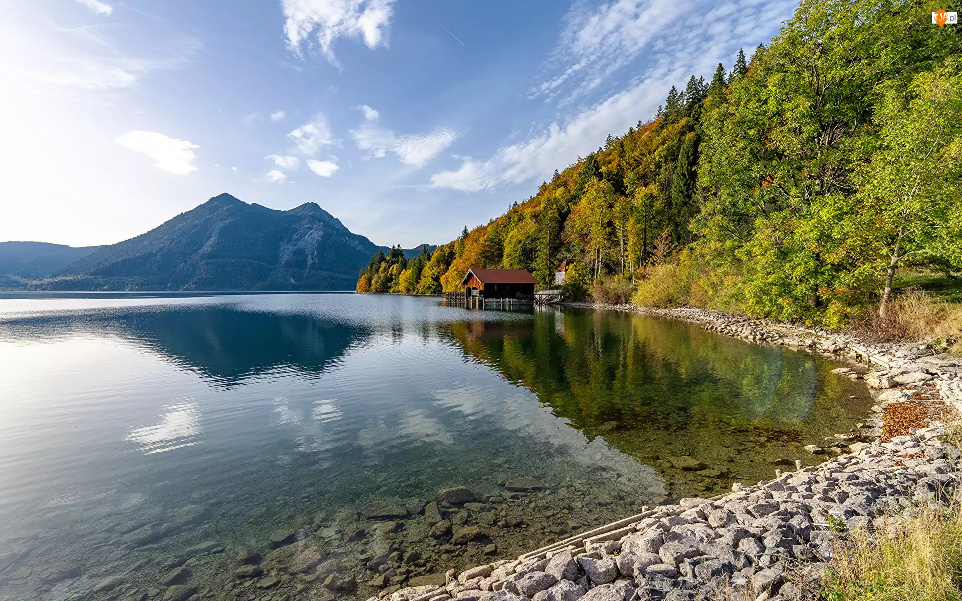 Alpy, Bawaria, Góry, Las, Domek, Jezioro, Walchensee, Niemcy, Kamienie