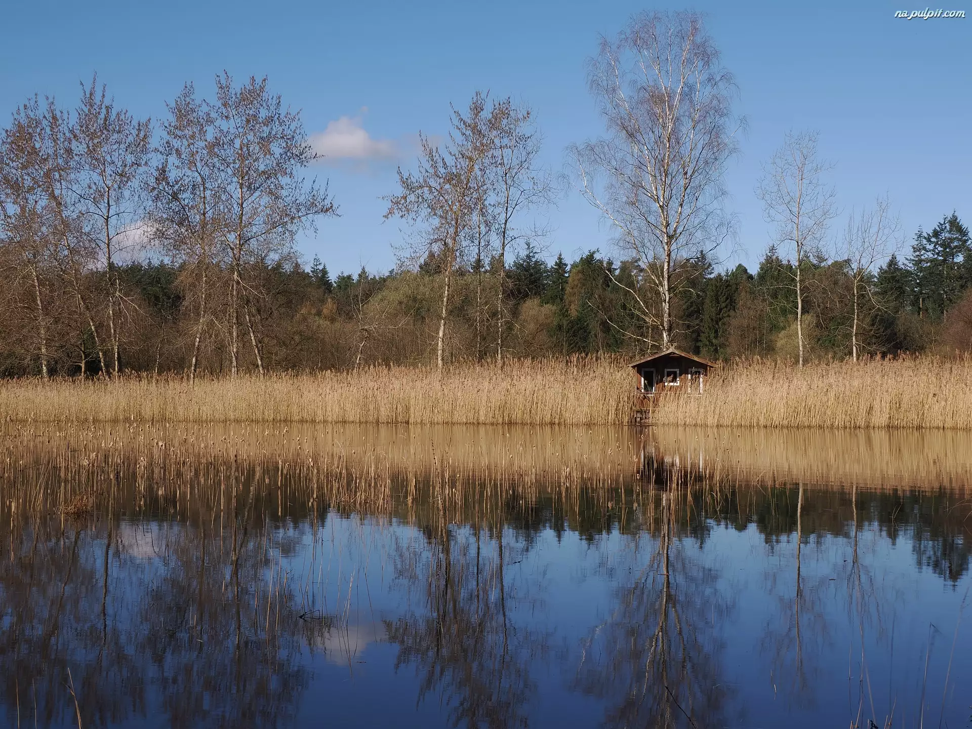 Domek pod bezlistnymi brzozami w szuwarach nad jez