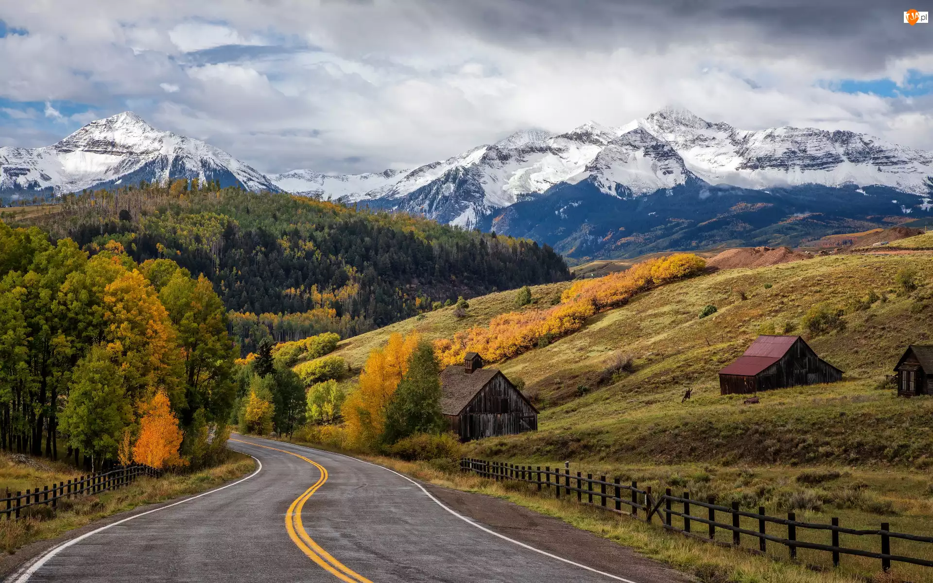 Domki, Stany Zjednoczone, Drzewa, Wzgórza, Chmury, Droga, Kolorado, Telluride, Ogrodzenie, Pola, Jesień, Góry, Wilson Peak