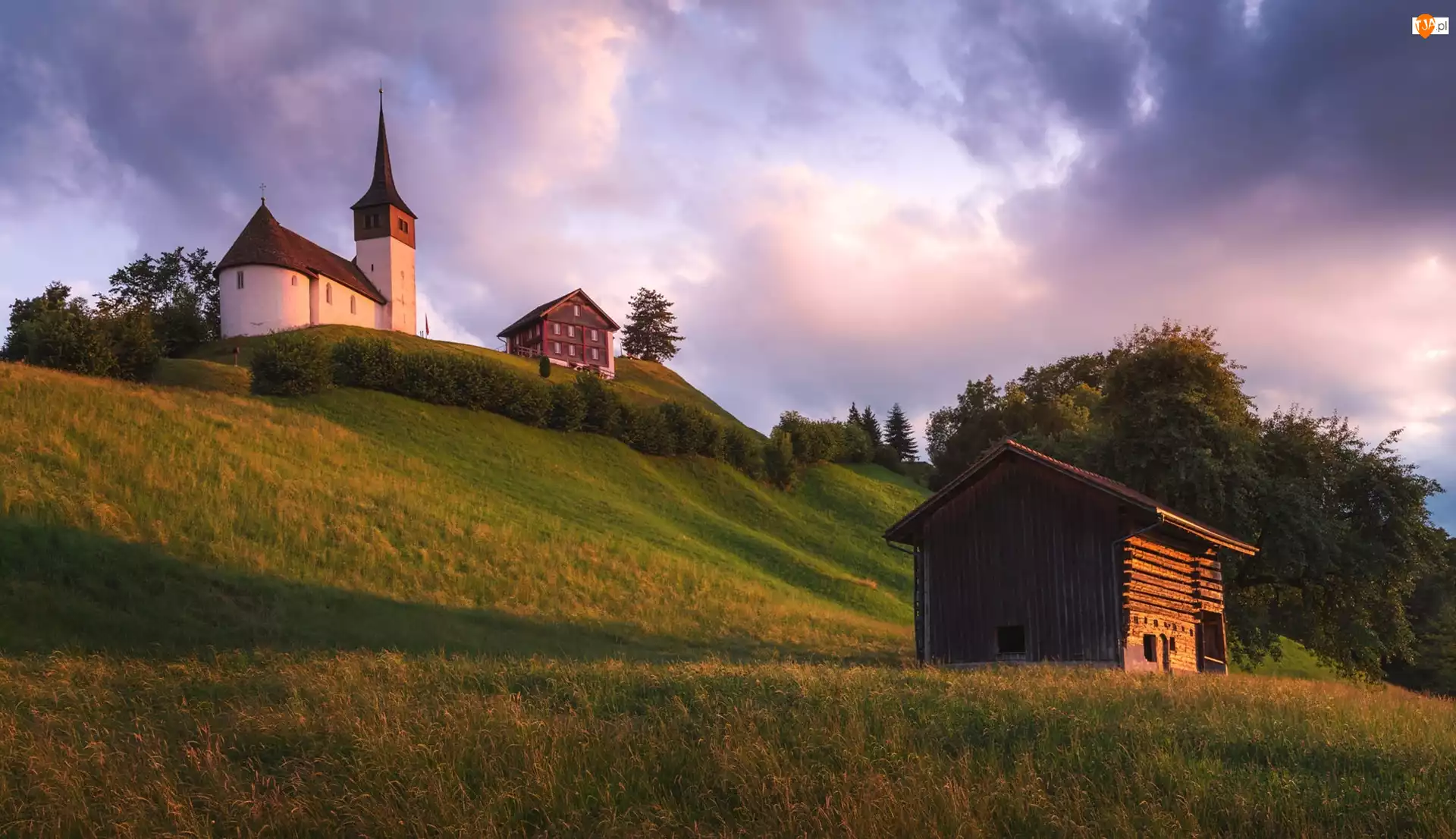 Domy, Chmury, Kościół, Wzgórze, Drzewa