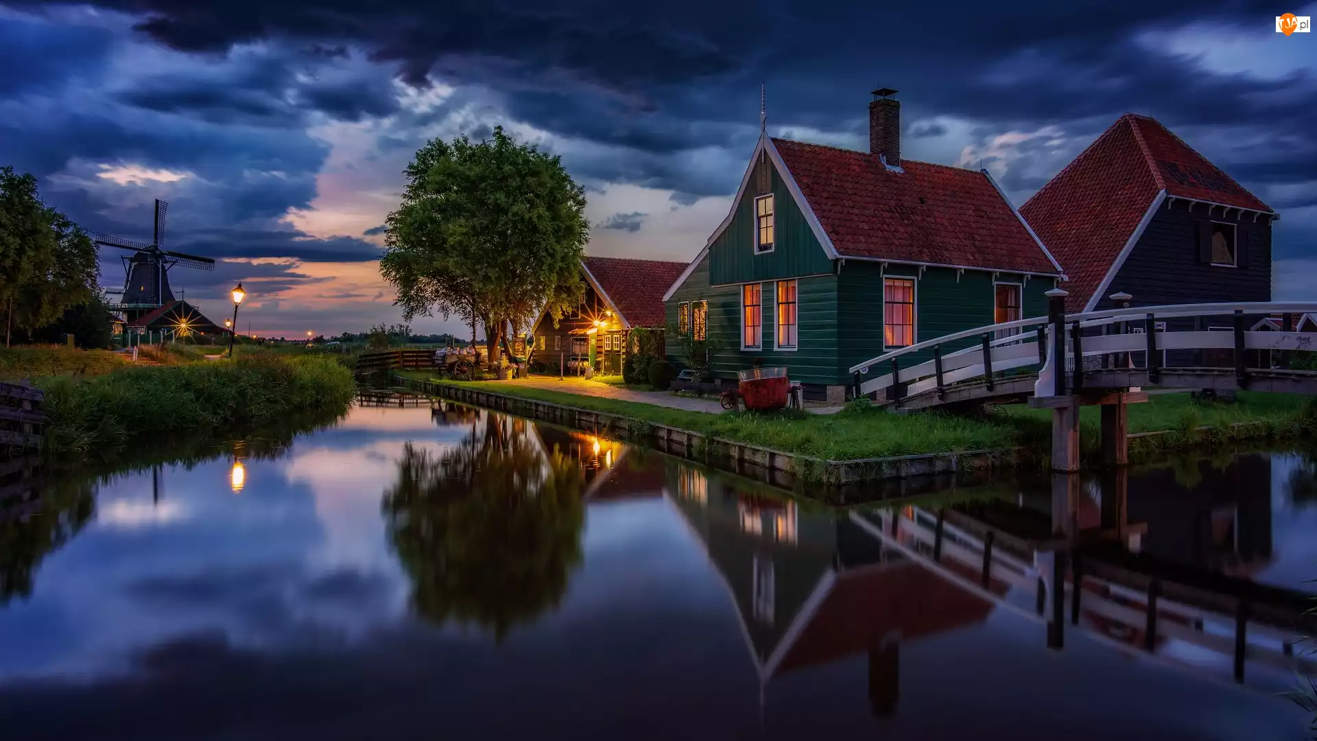 Most, Holandia, Domy, Rzeka, Skansen Zaanse Schans, Drzewo, Wieczór, Wiatrak