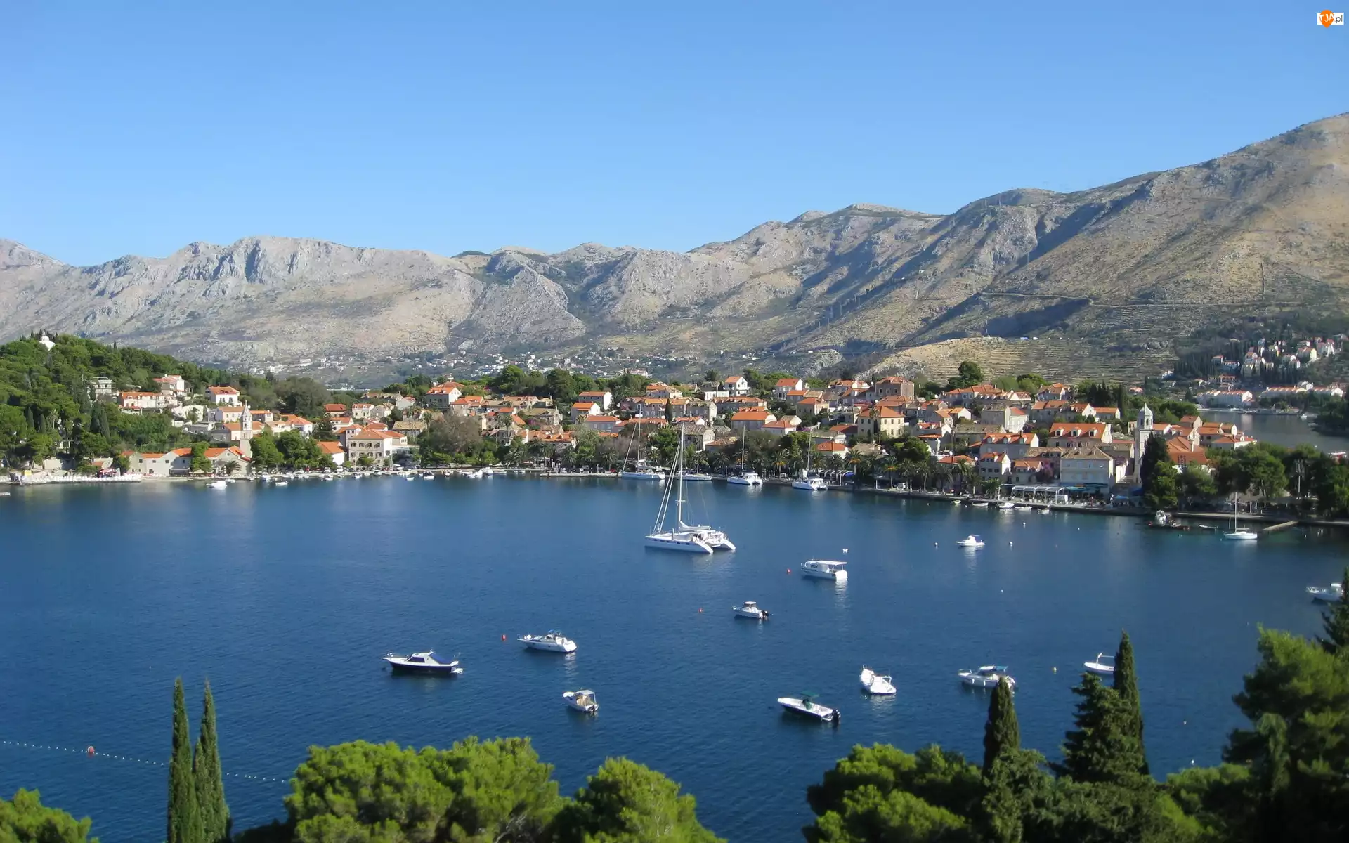 Domy, Jezioro, Katamaran, Motorówki, Góry