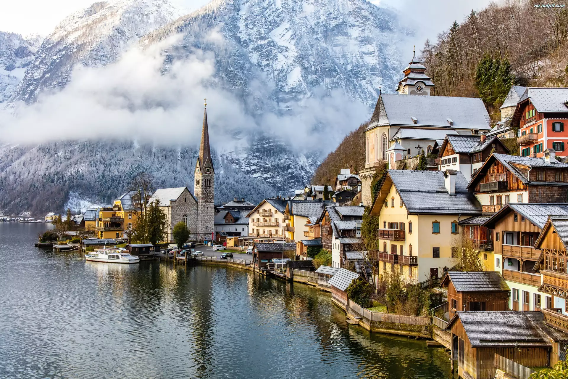 Hallstatt, Austria, Góry, Zima, Domy, Jezioro