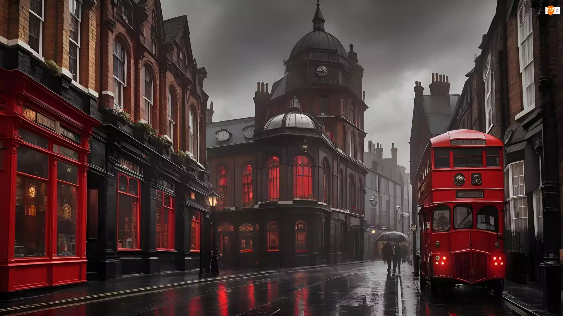 Autobus, Domy, Anglia, Grafika, Londyn, Deszcz, Ulica