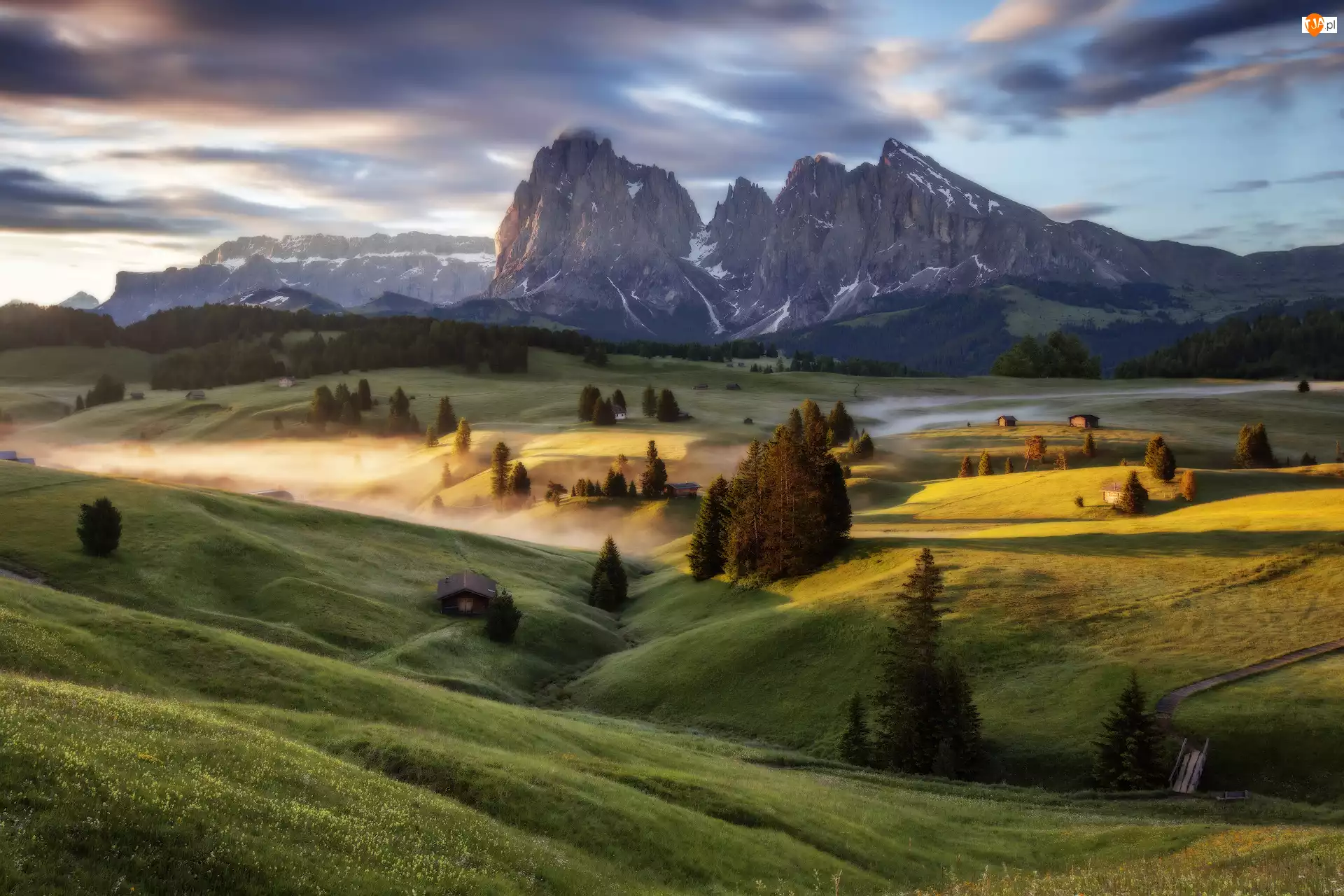 Dolomity, Wzgórza, Dolina Val Gardena, Płaskowyż Seiser Alm, Mgła, Góry Sassolungo, Włochy, Drzewa