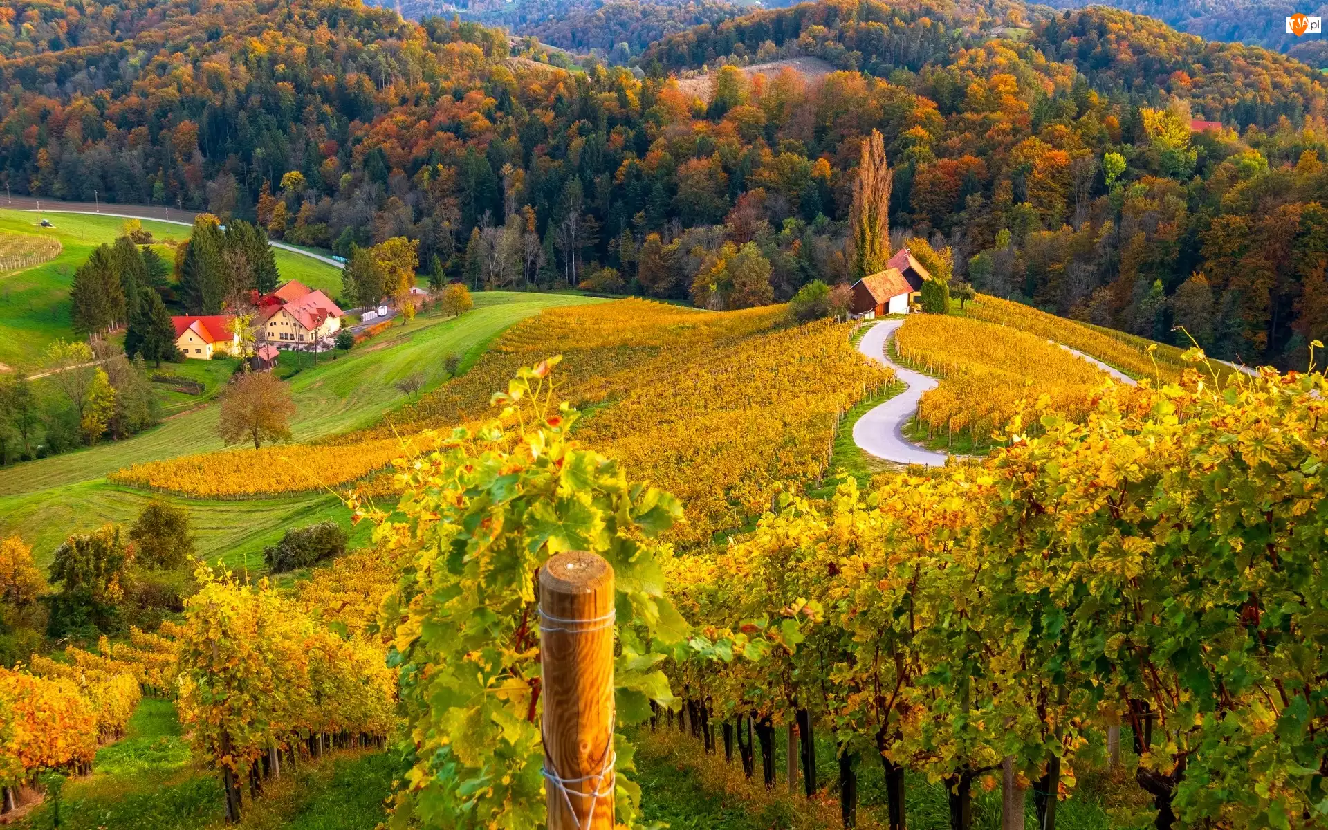 Domy, Plantacja, Serce, Słowenia, Wieś Spicnik, Pole, Las, Droga, Winnica, Drzewa, Jesień, Gmina Kungota