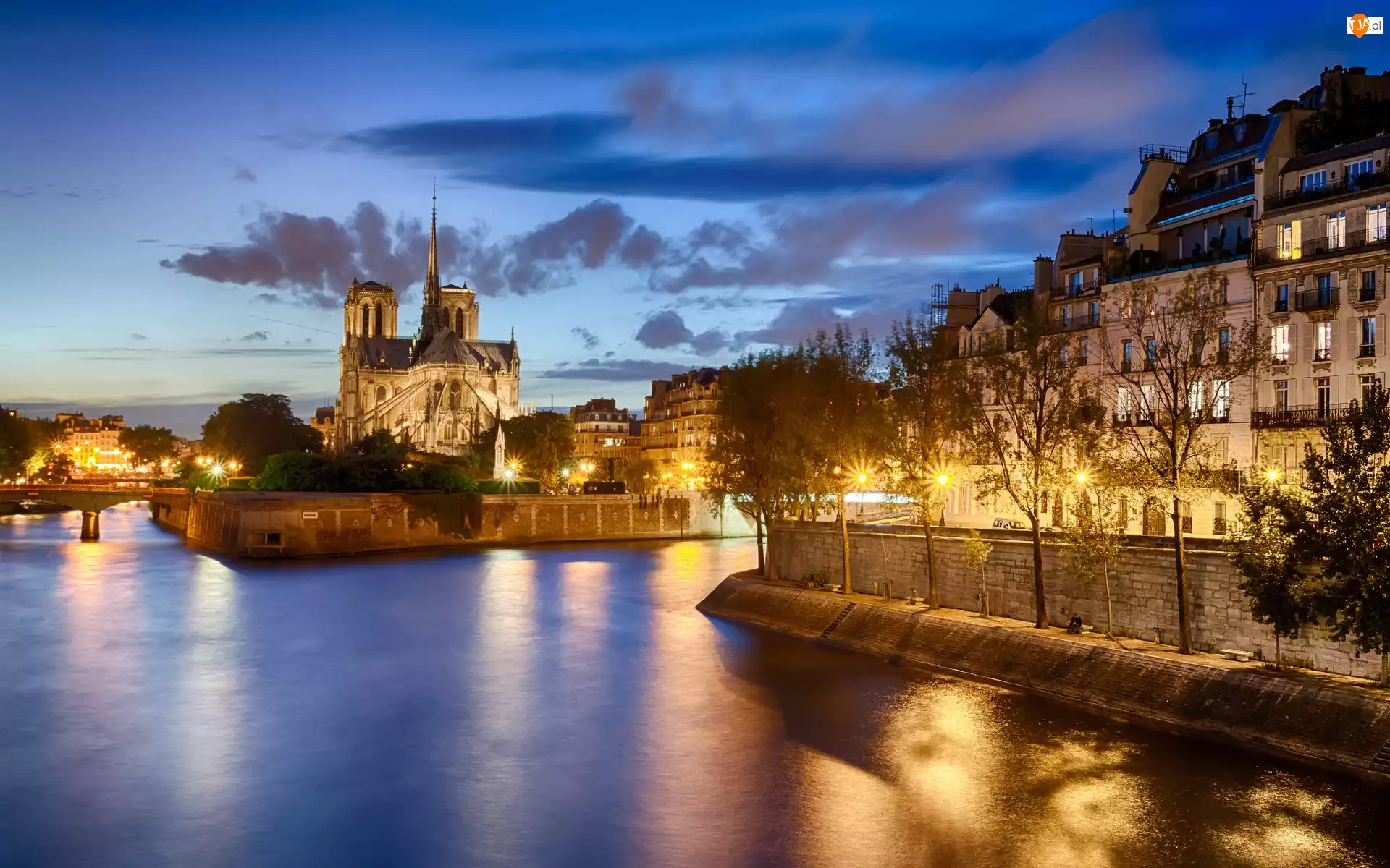 Dame, Paryż, Noc, Notre, Domy, Most, Rzeka