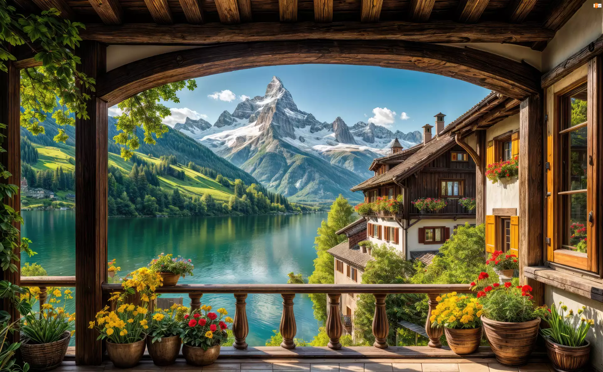 Domy, Taras, Góry, Grafika, Jezioro, Widok