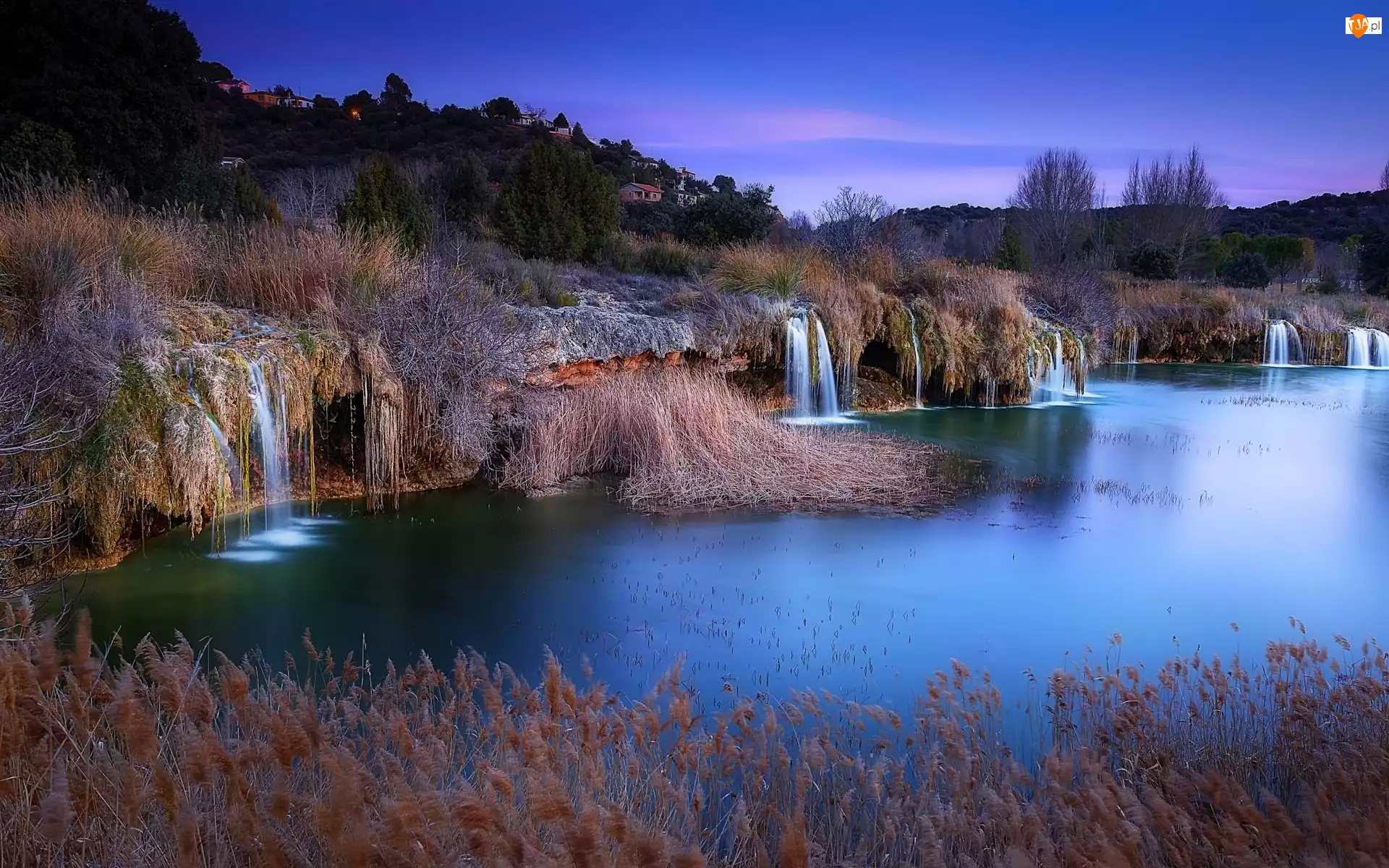 Domy, Trawy, Wzgórze, Wodospady, Jezioro, Drzewa