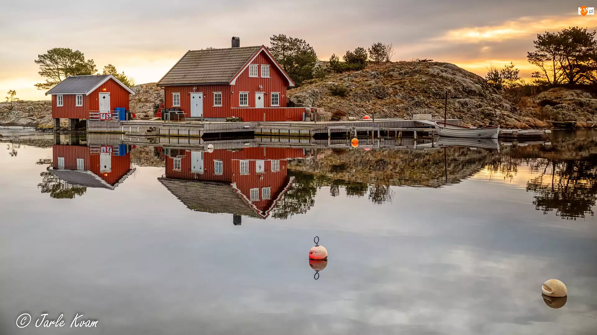 Łódka, Odbicie, Pomost, Domy, Jezioro