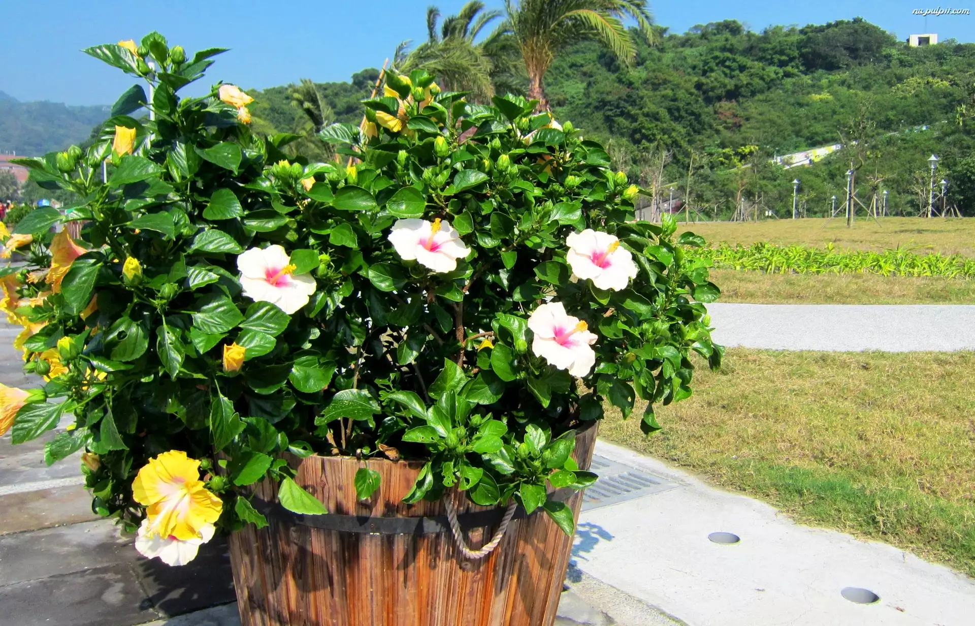 Hibiskusy, Donica, Kwiatki, Park, Ketmia
