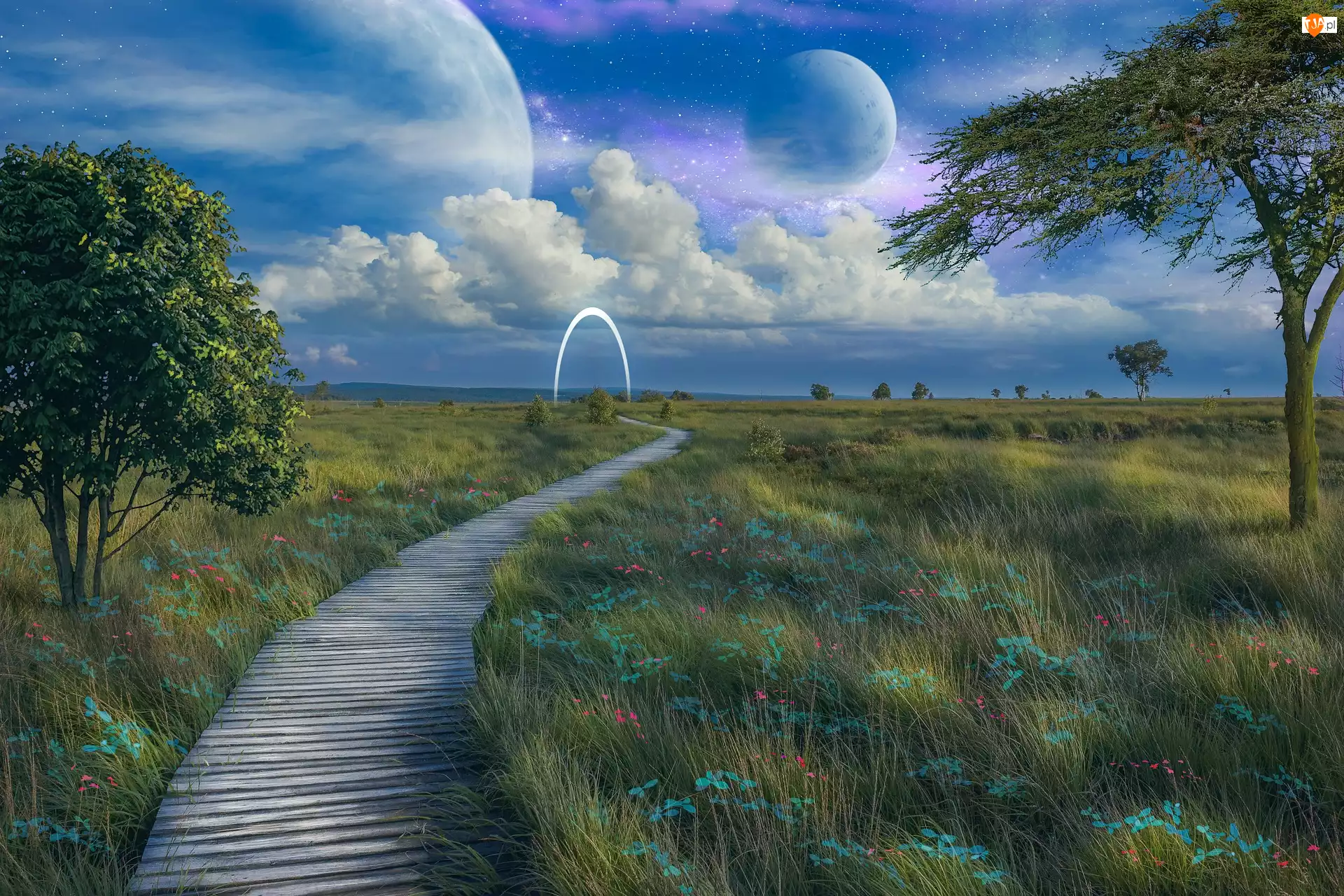 Łąka, Fotomontaż, Pomost, Planety, Drzewa, Chmury