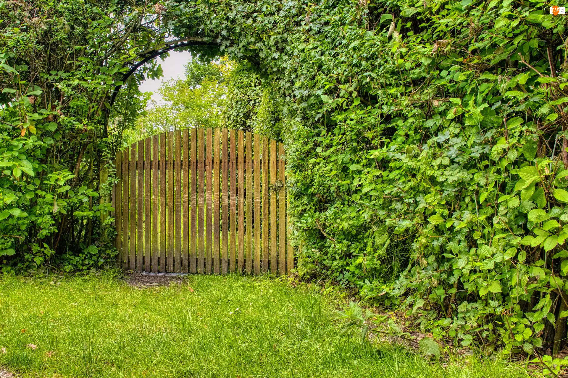 Zielone, Ogród, Drewniana, Brama, Krzewy