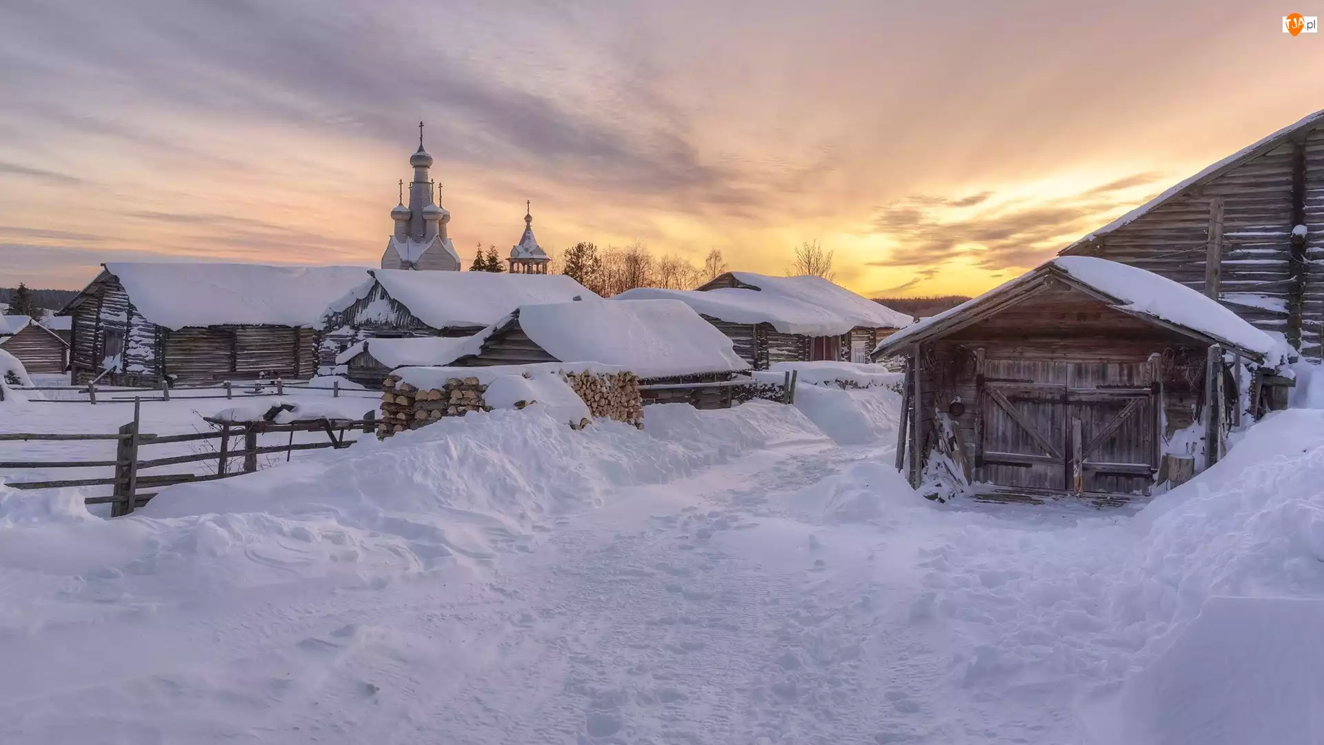 Drewniane, Zima, Szopy, Wschód słońca, Domy, Cerkiew