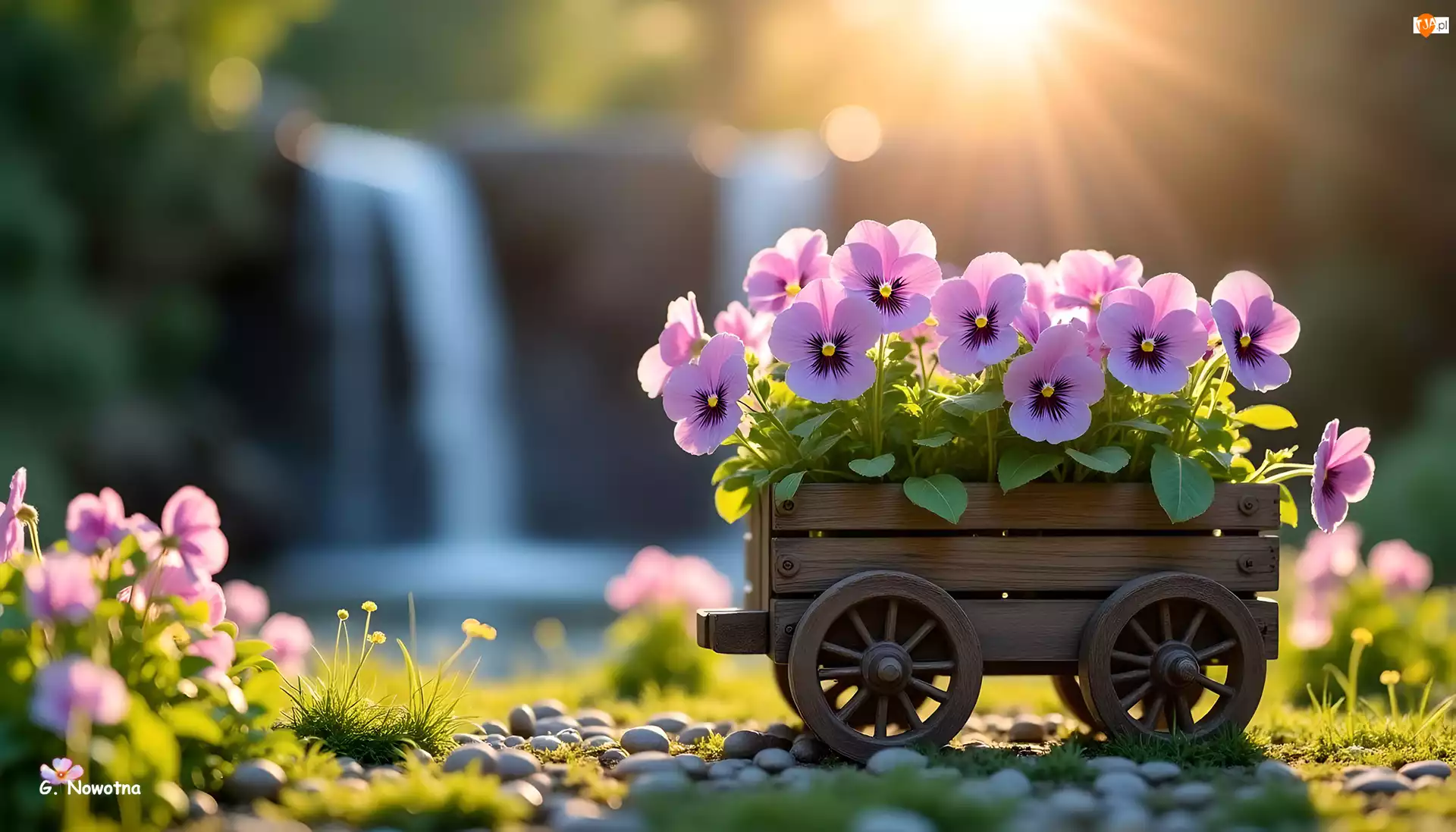 Drewniany, Grafika, Bratki, Różowe, Wózek