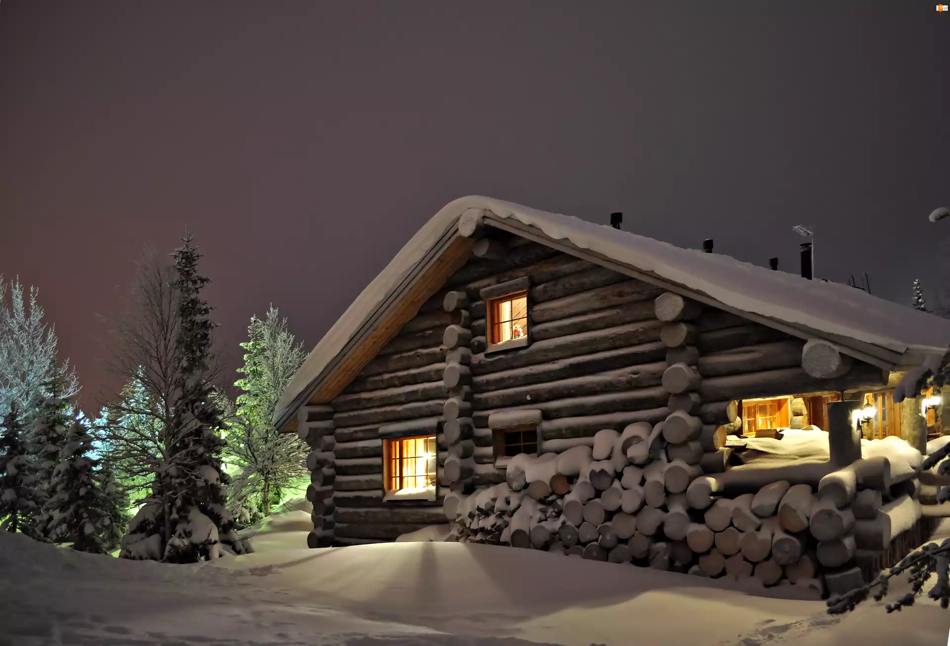 Drewniany, Zima, Domek, Drzewa