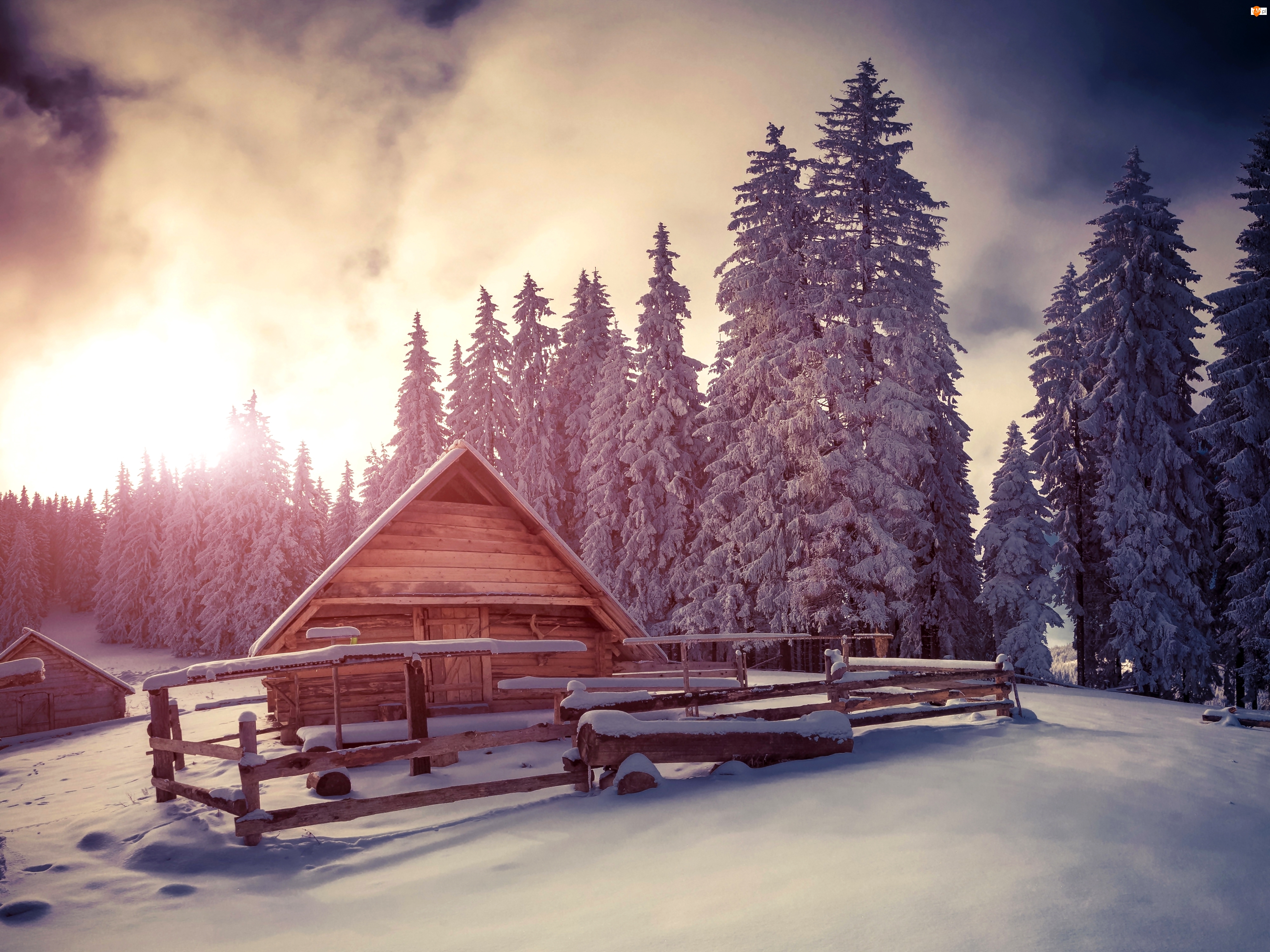 Drewniany, Zima, Domek, Las