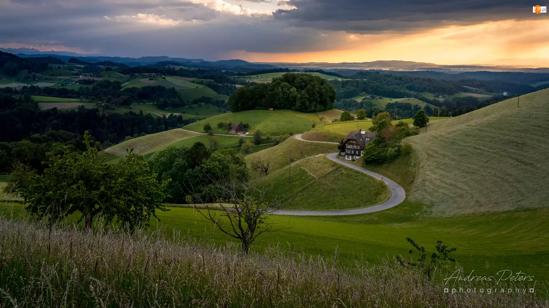 Droga, Dom, Drzewa, Wieś, Wzgórza, Pola