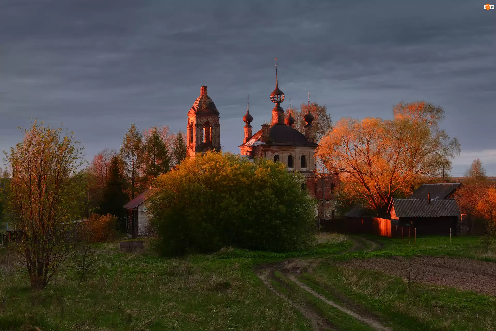 Droga, Domy, Cerkiew, Ruina, Drzewa