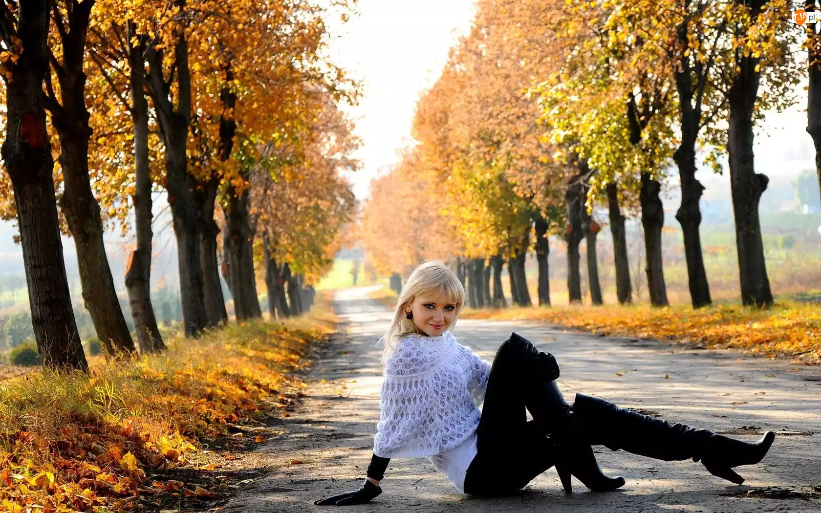 Droga, Liście, Młoda, Jesień, Dziewczyna, Drzewa
