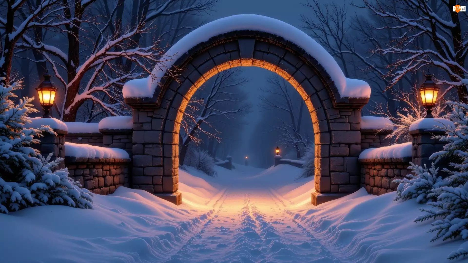 Droga, Noc, Łuk, Drzewa, Zima, Latarnie, AI, Brama