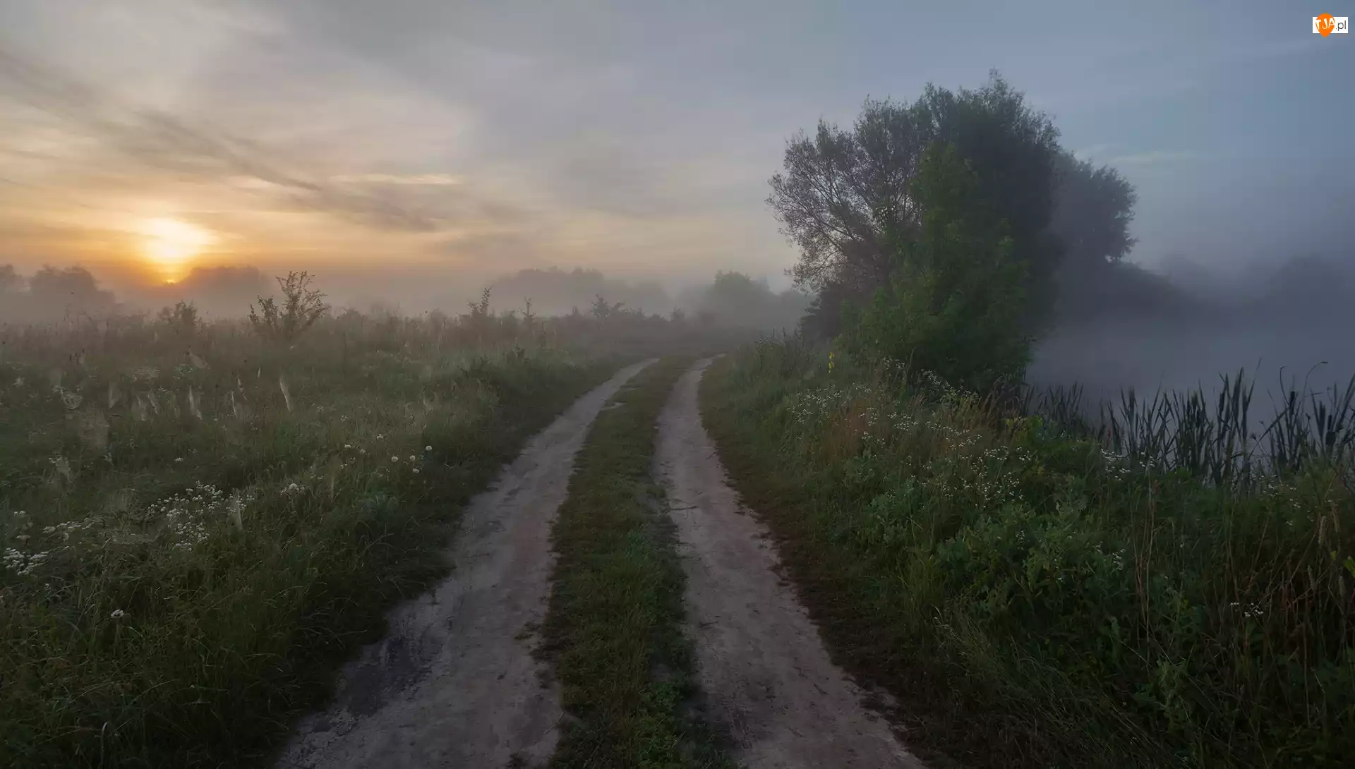 Droga, Trawa, Mgła, Wschód słońca, Drzewa