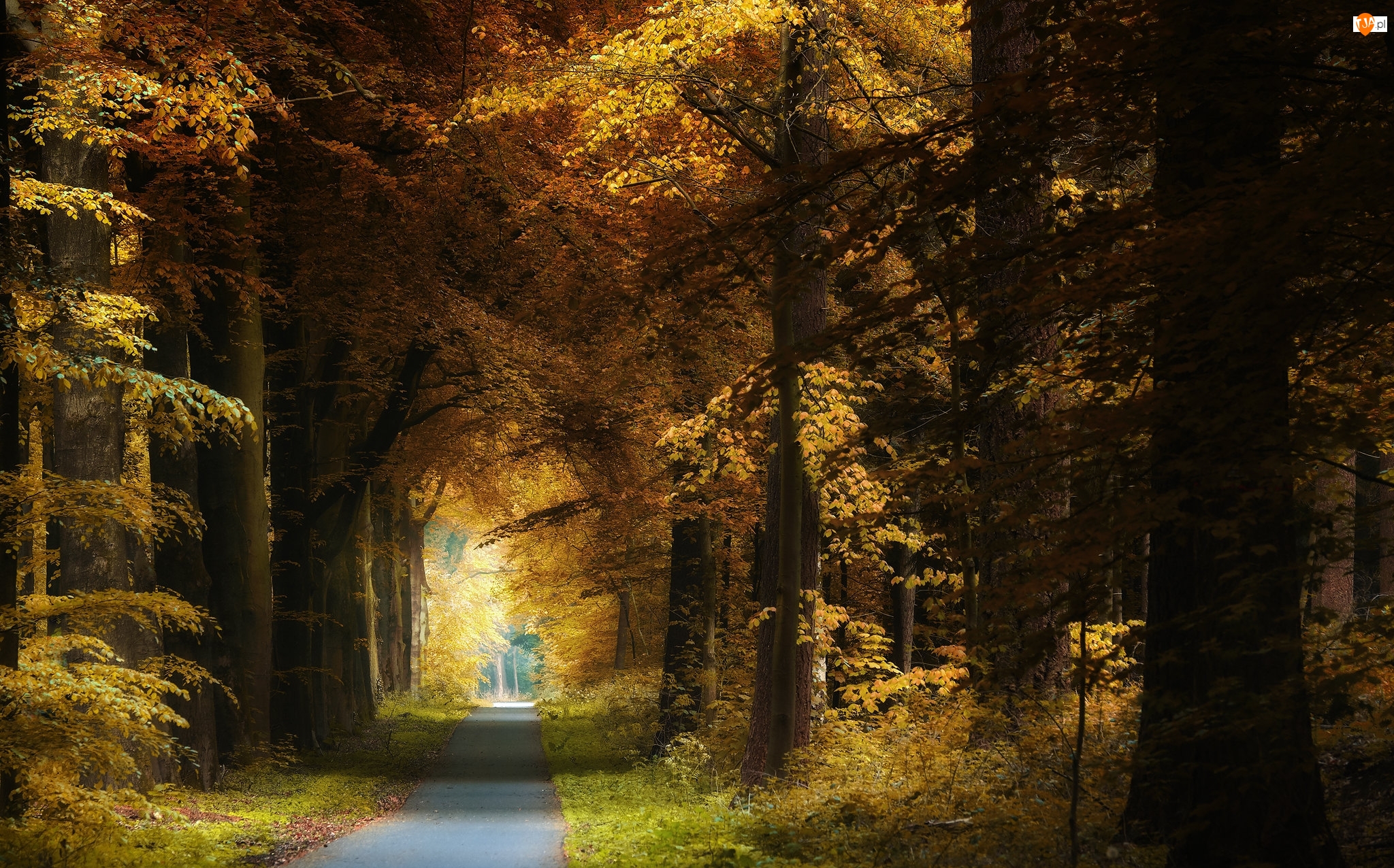 Droga, Drzewa, Las, Jesień, Żółto-brązowe
