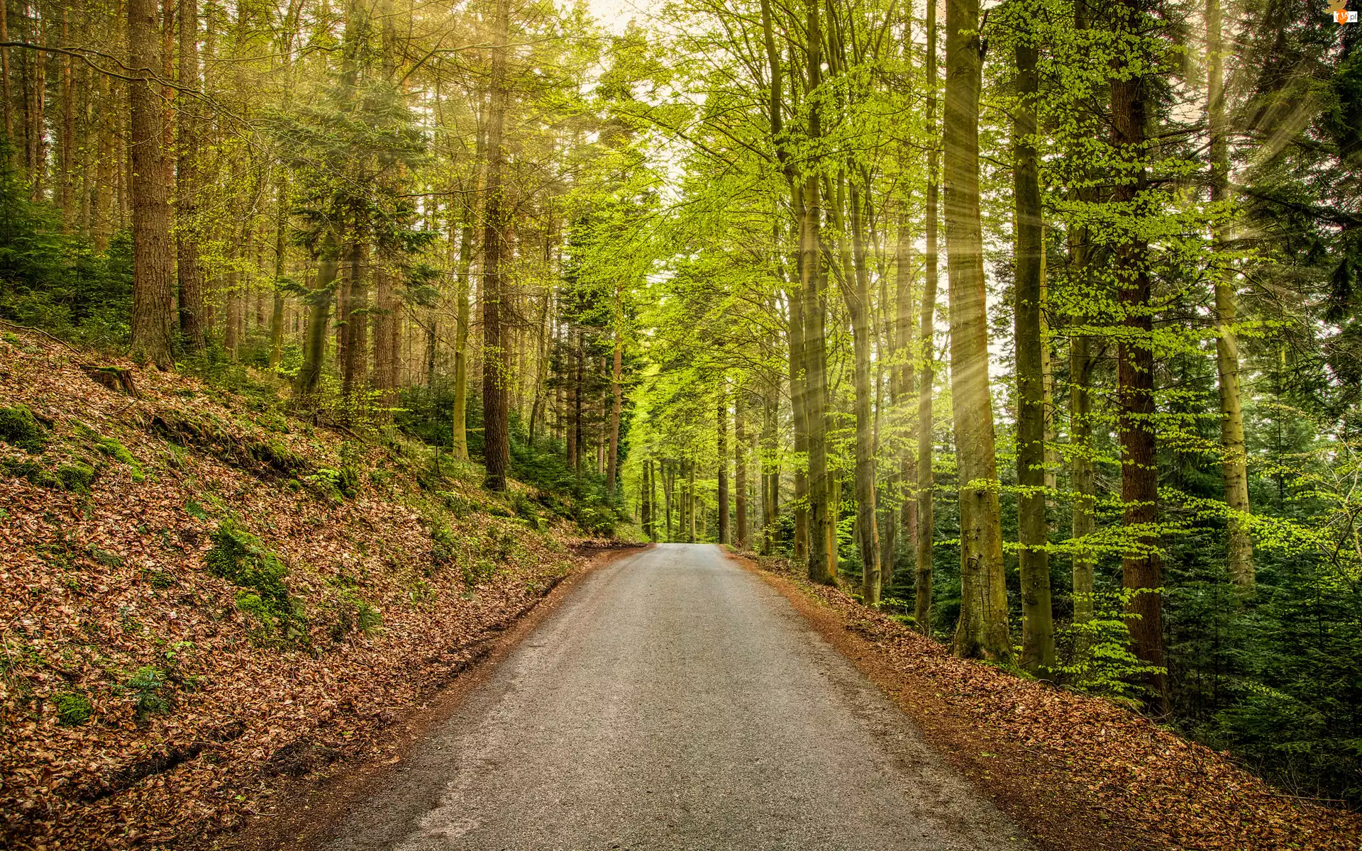 Droga, Wiosna, Drzewa, Las, Promienie słońca