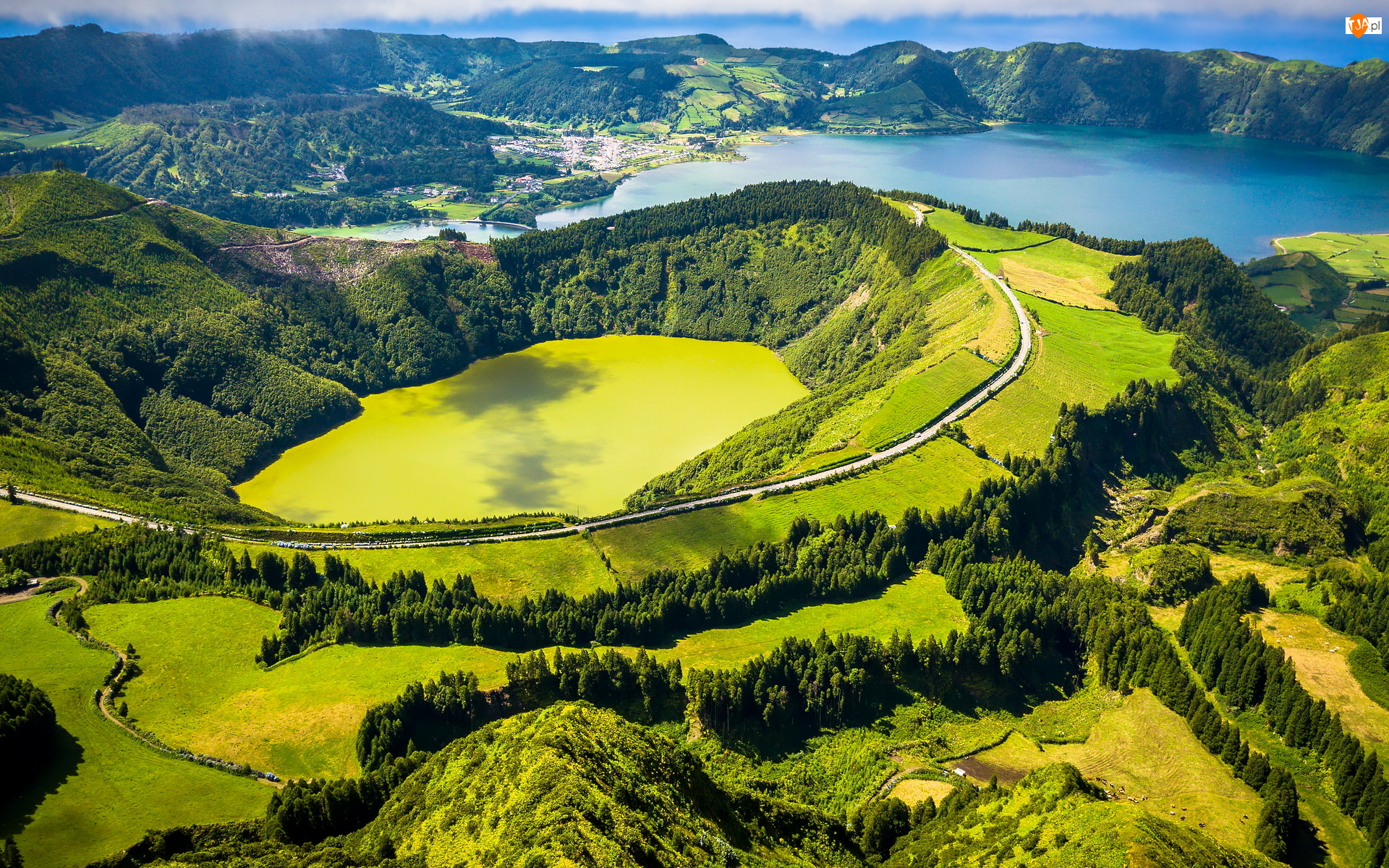 Portugalia, Lagoa de Santiago, Azory, Gmina Ponta Delgada, Wyspa Sao Miguel, Góry, Wzgórza, Jeziora, Drzewa
