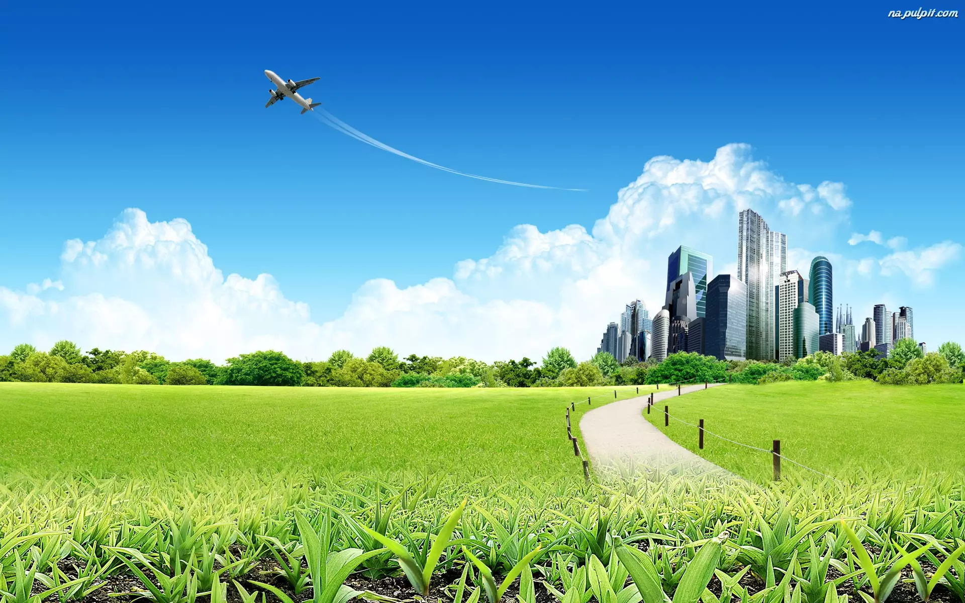 Dróżka, Chmur, Łąka, Samolot, Wąska, Drapacze