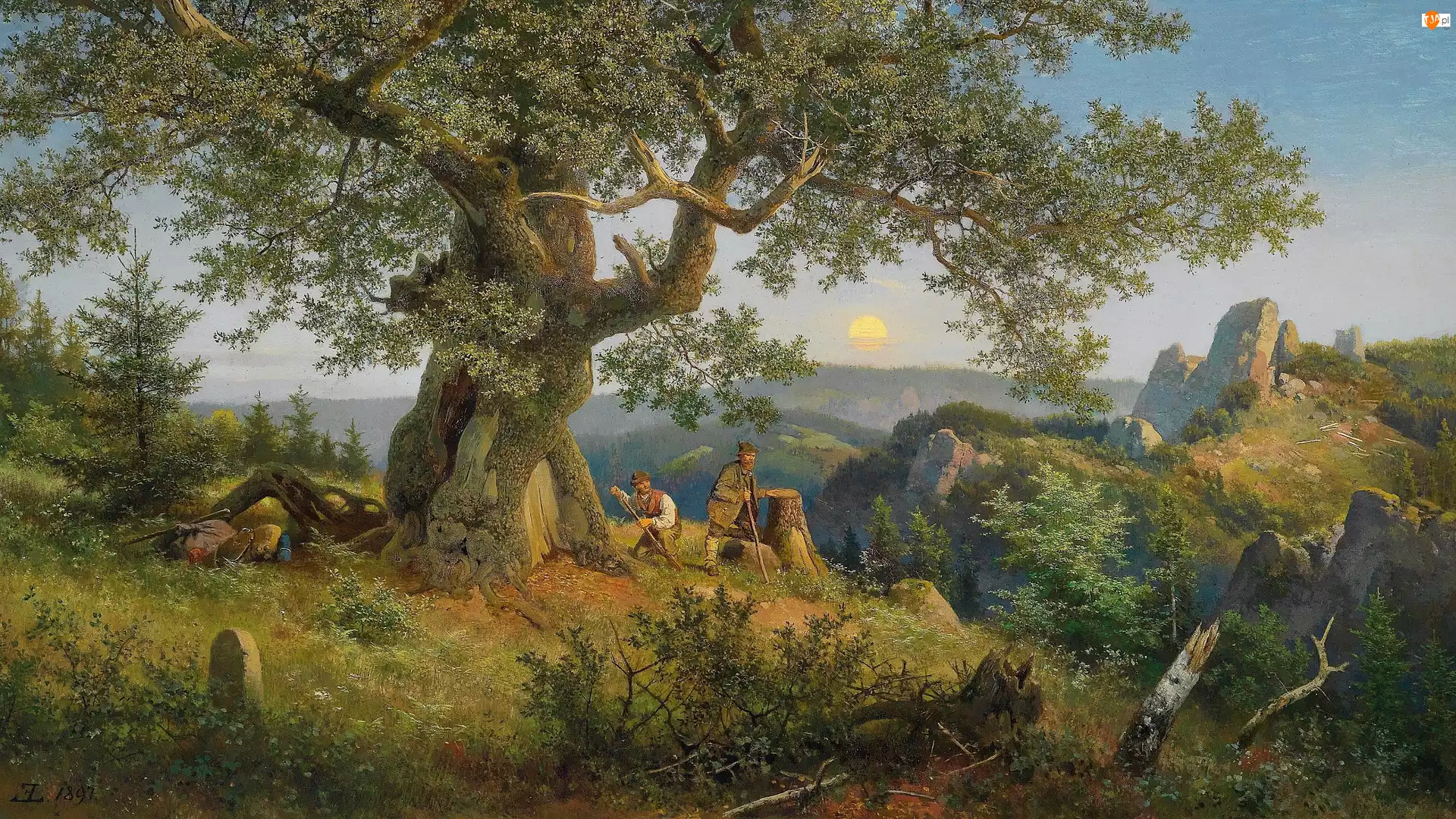 Obraz, Malarstwo, Mężczyźni, Drzewo, Eduard Leonhardi, Wzgórze
