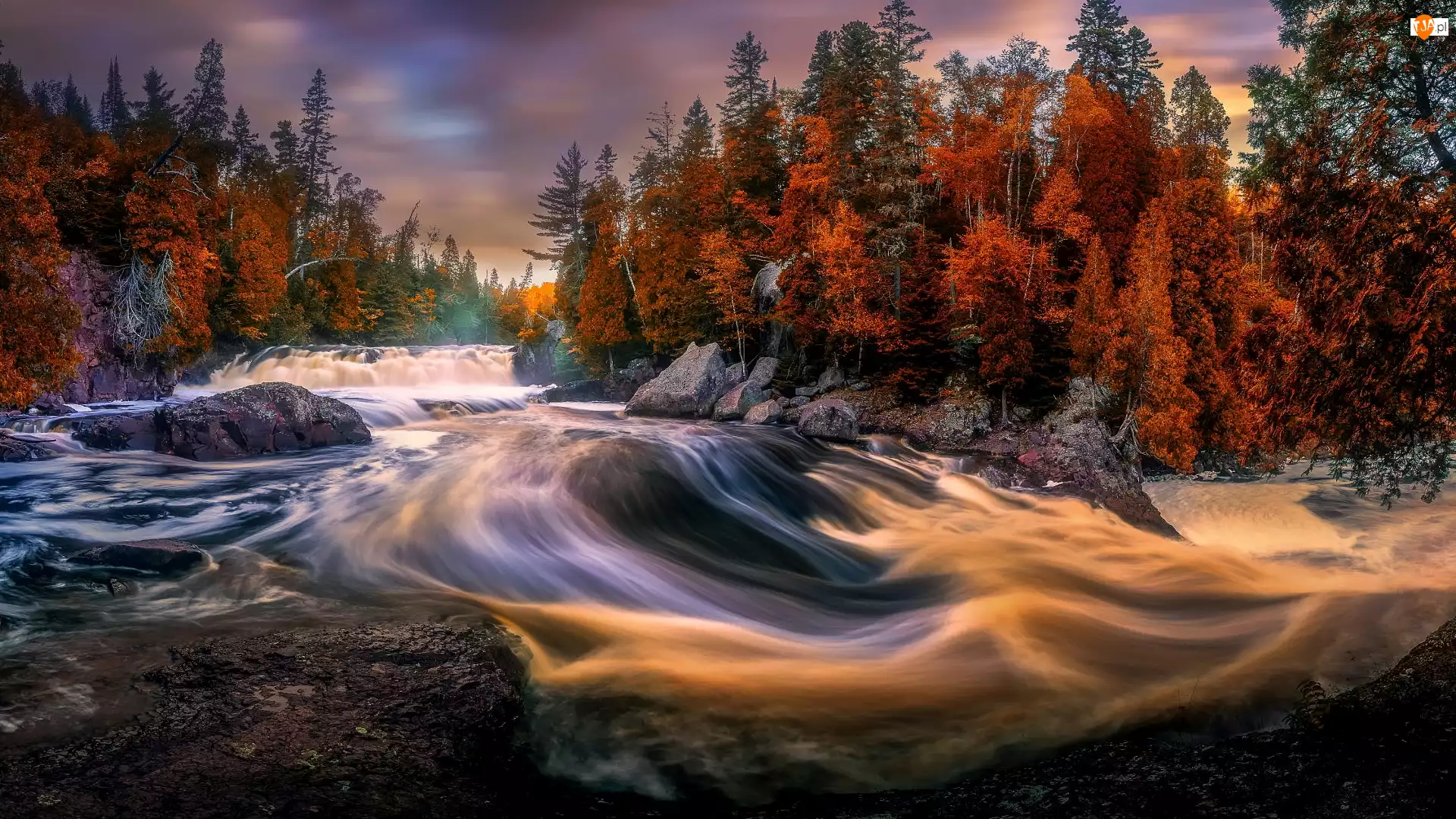 Park stanowy Tettegouche, Rzeka, Kamienie, Minesota, Drzewa, Las, Stany Zjednoczone, Skały