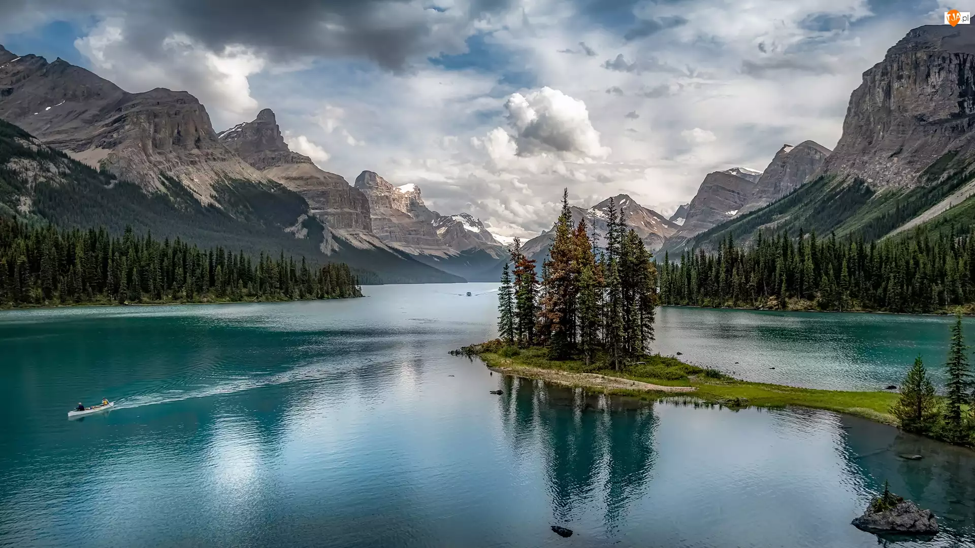 Drzewa, Alberta, Chmury, Wyspa Ducha, Góry, Park Narodowy Jasper, Jezioro, Kanada, Maligne Lake