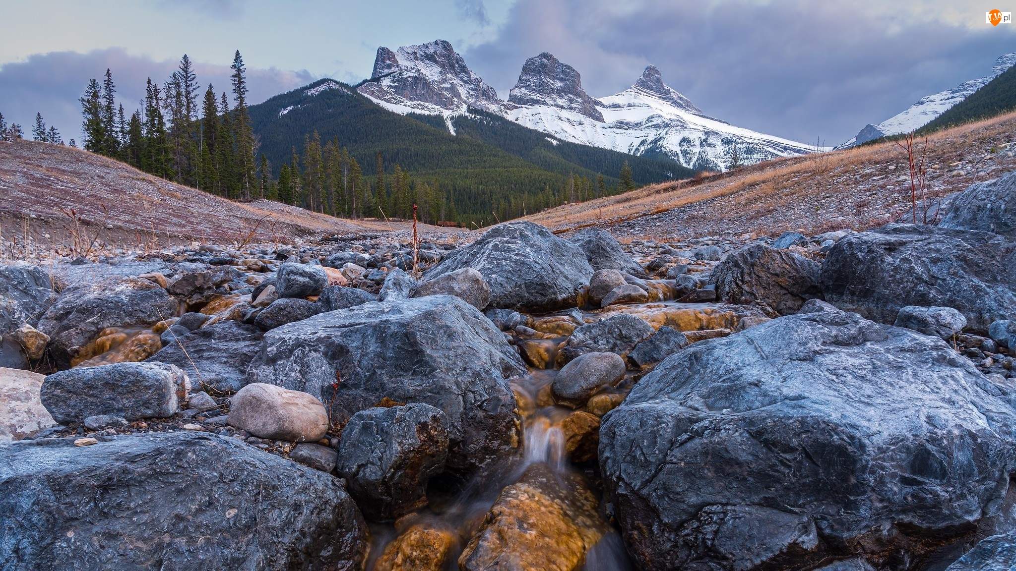 Drzewa, Alberta, Potok, Three Sisters, Kamienie, Góry, Canadian Rockies, Kanada, Góra