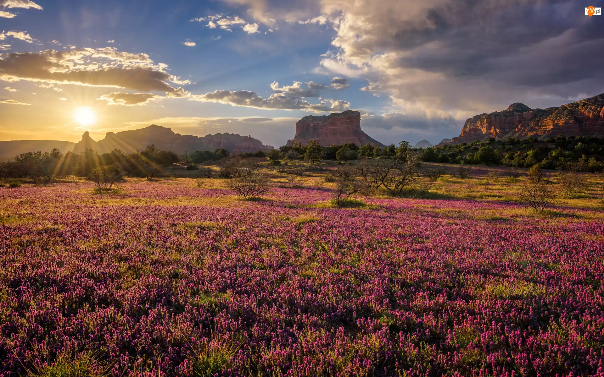 Drzewa, Arizona, Łąka, Chmury, Krzewy, Stany Zjednoczone, Skały, Castilleja exserta, Sedona, Fioletowe, Kwiaty, Wschód słońca