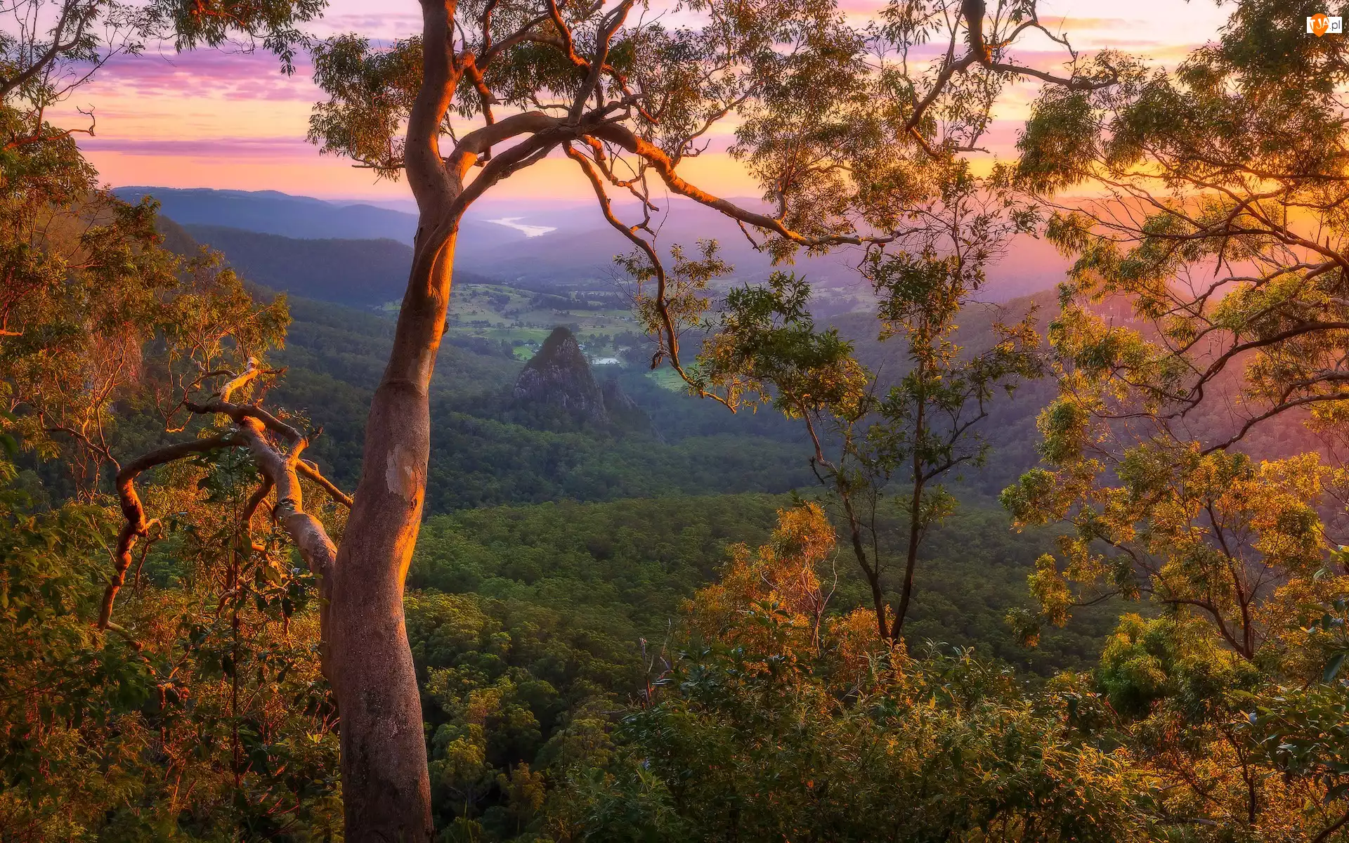 Drzewa, Australia, Dolina, Gałęzie, Queensland, Numinbah Valley, Wschód słońca, Góry
