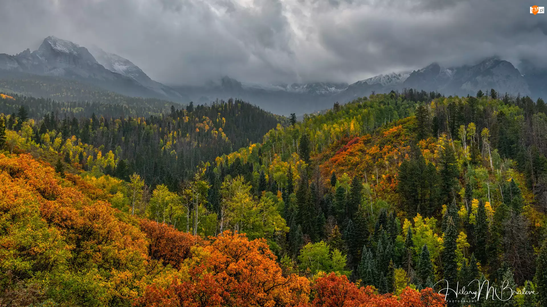 Drzewa, Chmury, Jesienne, Góry, Ciemne